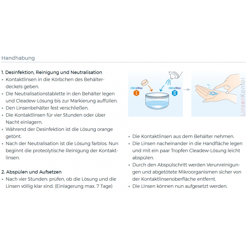 Die Cleadew Soft Flüssigkeit dient zum Aufbewahren und Abspülen der Kontaktlinsen. Sie enthält keine Konservierungsmittel, die die Augen reizen können oder den Tragekomfort der Kontaktlinsen beeinflussen können. Nachdem die Reinigung und Desinfektion beendet ist, wird die Lösung wieder klar und ist für das Auge unbedenklich. Die Kontaktlinsen müssen vor dem Aufsetzen einfach mit etwas frischer Cleadew Soft Flüssigkeit abgespült werden, um die gelösten Ablagerungen und Keime zu entfernen. Schon sind die frischen Kontaktlinsen einsatzbereit.